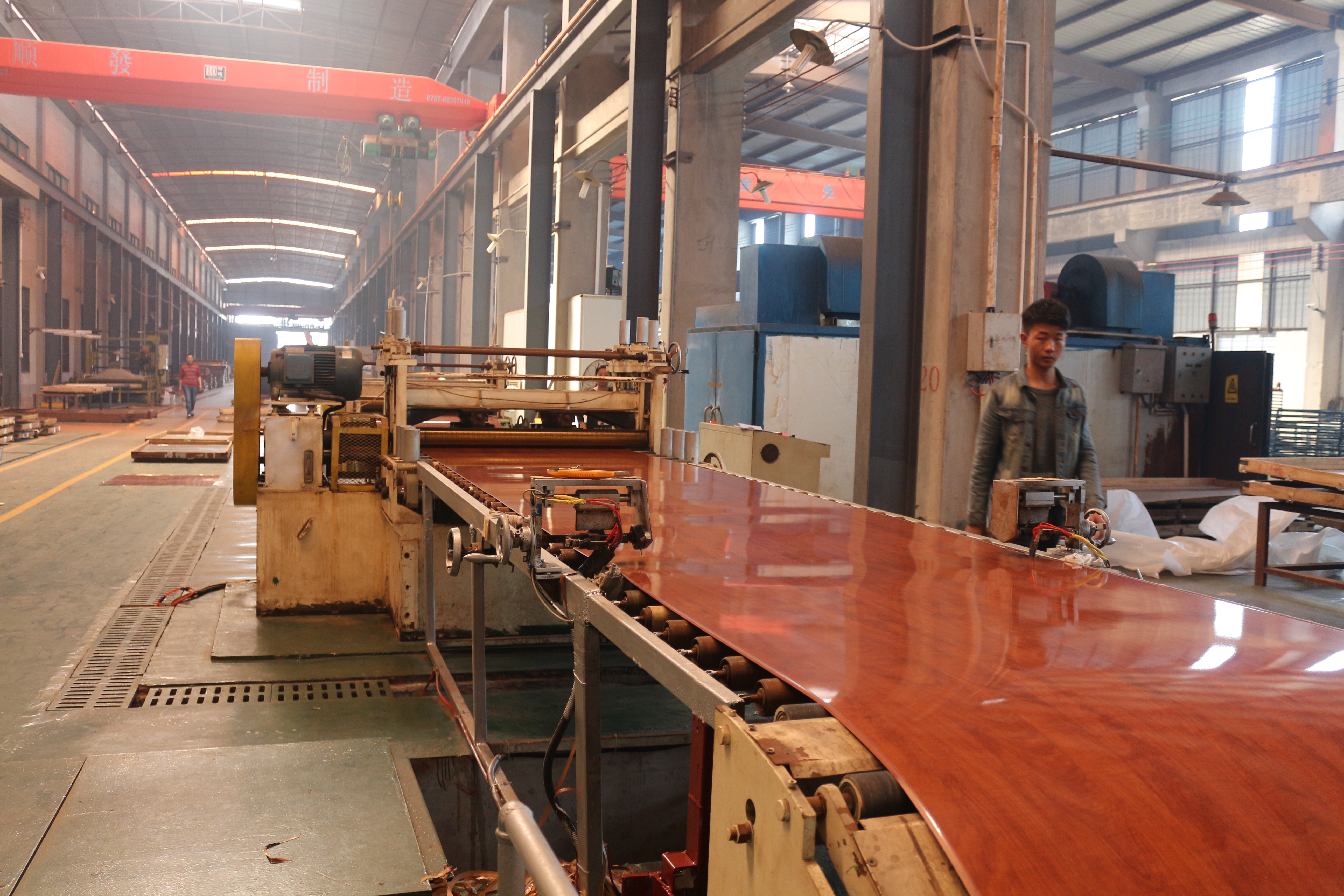 (4)熱覆合將塑料覆合膜與金屬板同時(shí)送入上下覆合輥中間,上下輥在熱覆合裝置的加熱系統(tǒng)供熱下,產(chǎn)生250C的高溫,使塑料薄膜在上下輥的壓力和高溫的作用下,熱熔在-一起。