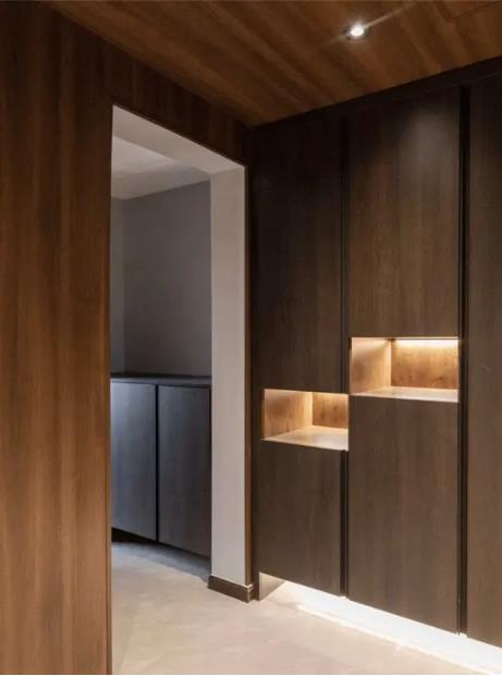 黑胡桃在全屋定制中選擇比較多的一款紋理,顏色呈淺黑褐色帶紫色,有時有波浪形或卷曲樹紋,形成賞心悅目的圖案,舒適的表層質感,觸之溫潤如玉。胡桃木款的鋁基復合板具有耐沖撞摩擦,耐腐朽,容易干燥,不易變形,易施工,防火阻燃,零甲醛環(huán)保等特點。