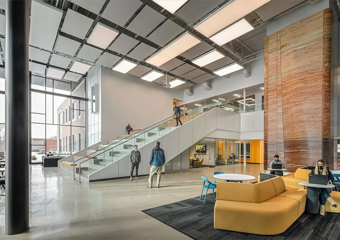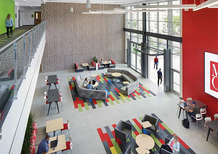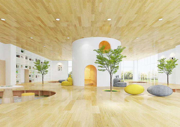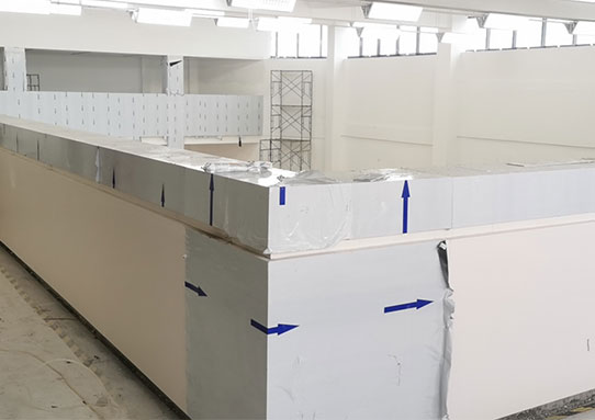 使用板材:4mm鋁基科技板,板材應用:體育館墻面、走廊、扶手、柱等,紋理花色:紅松木紋、瓷白,安裝方式:龍骨卡槽干掛